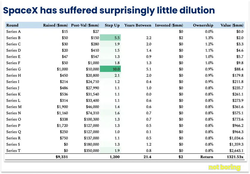 SpaceX, now America’s most valuable private company at $350 billion, has also been among its most capital intensive. But, and this is the big one, its fundraising hasn’t been particularly dilutive. SpaceX has experienced less than 50% dilution since its first outside funding two decades ago, and Elon Musk still personally owns an estimated 42% of the company.