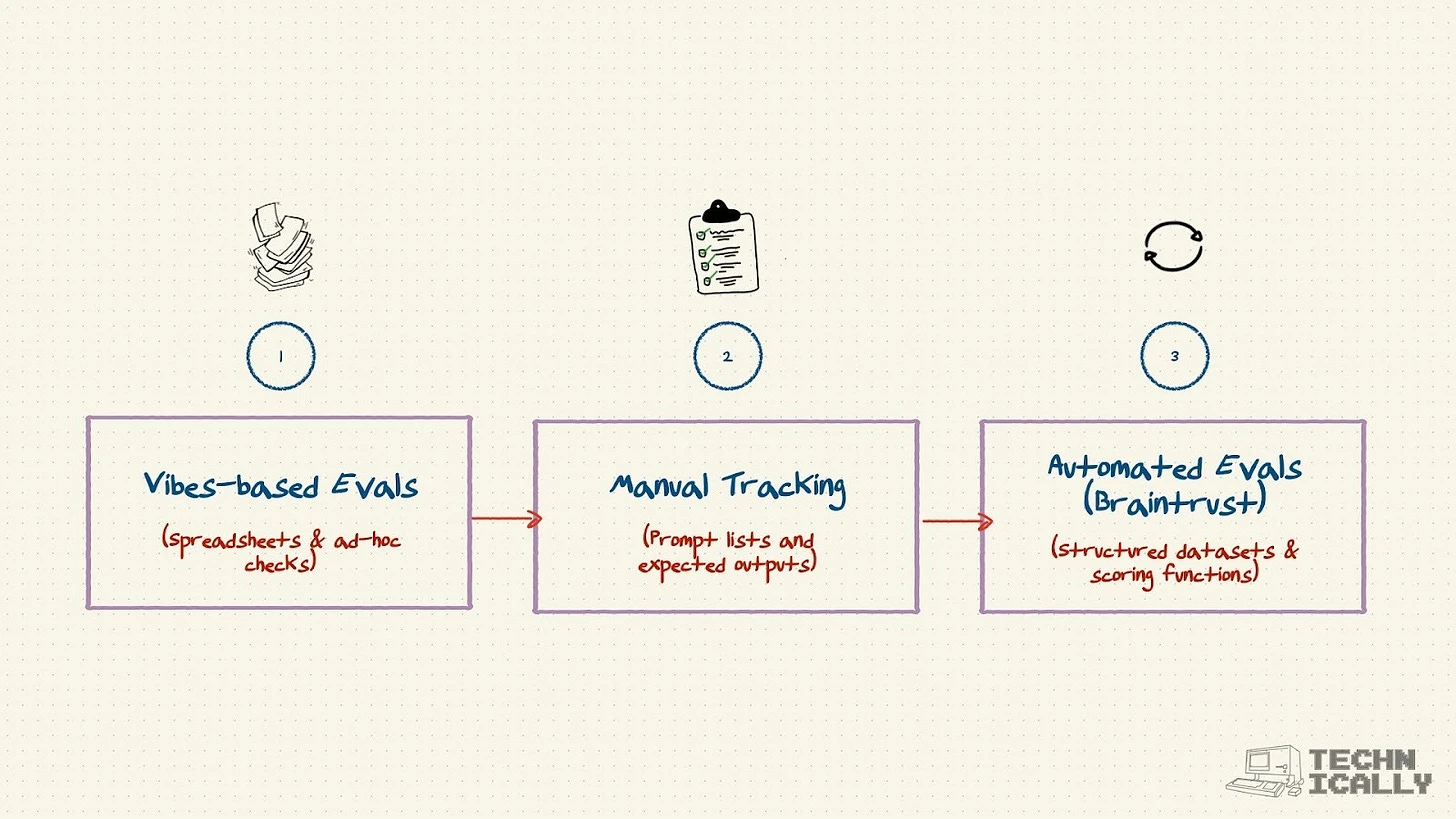Most people start with not doing evals at all (“the vibes-based approach”). They might have a spreadsheet that tracks the different prompts they have running in their app, and what kind of outputs they are seeing.